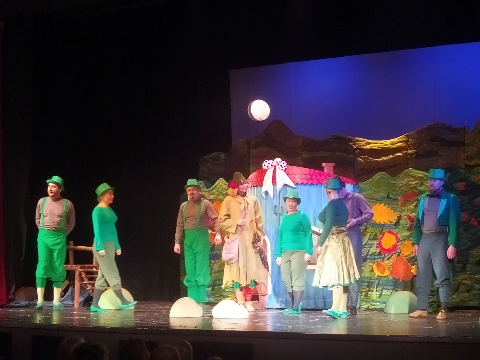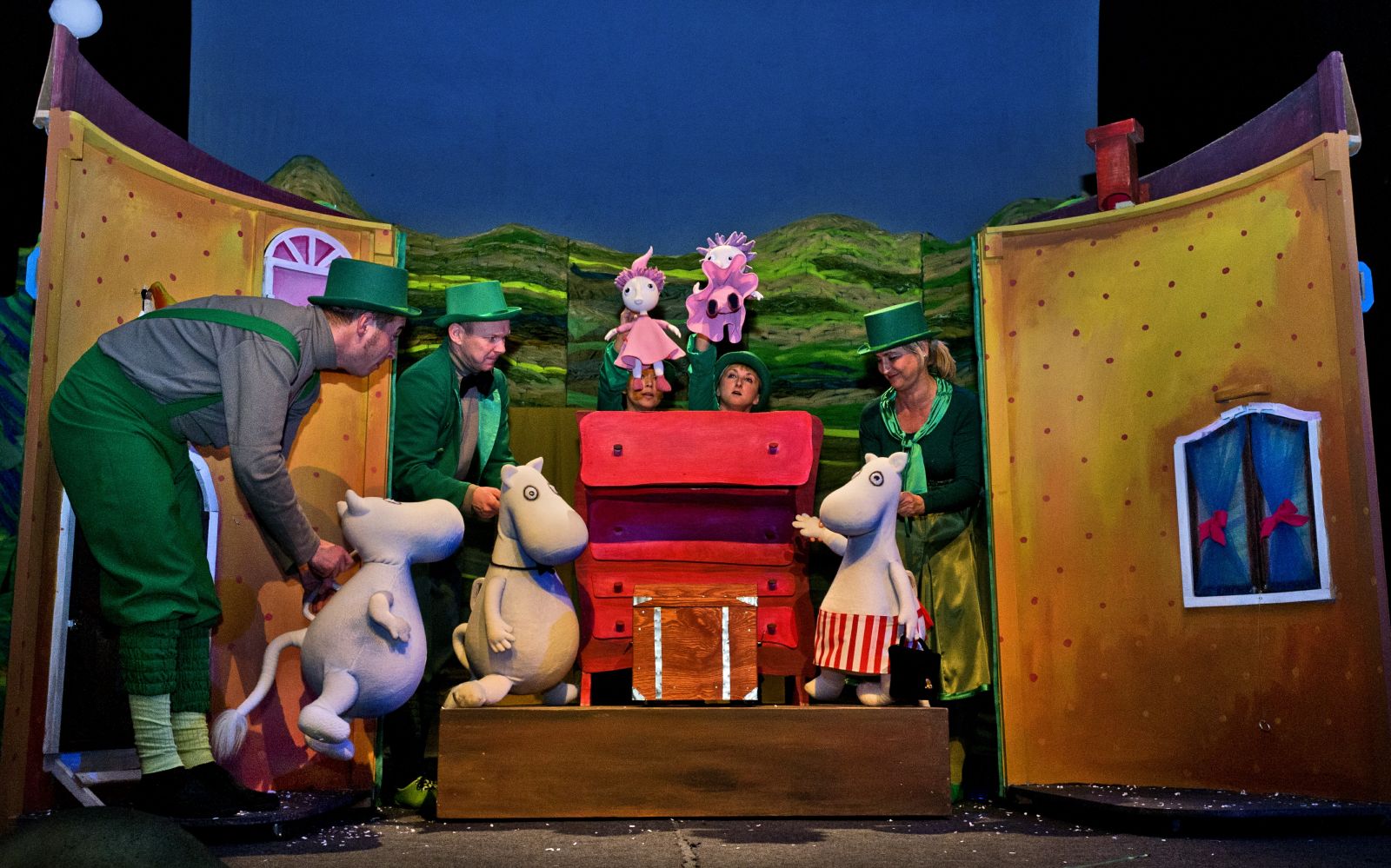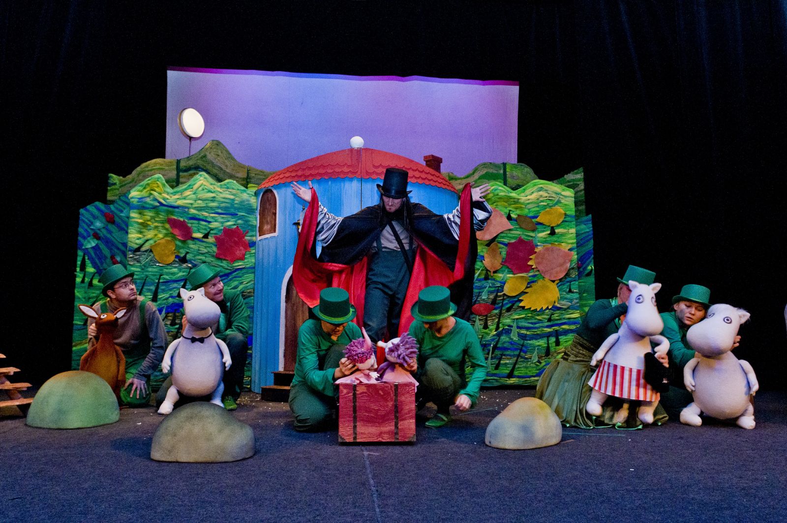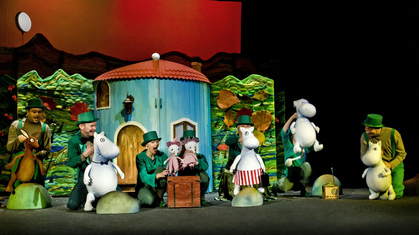 Przedstawienie przypomniało znane wielu pokoleniom przygody mieszkańców tej niezwykłej doliny. Kiedy przyszedł czas przebudzenia się z zimowego snu w domu Muminka zjawili się serdeczni przyjaciele rodziny, ale także goście, którzy - jak się okazało - nie zawsze mają dobre intencje. I pewnie to byłby zwykły dzień spędzony na zabawach przed domem, gdyby nie pewien tajemniczy kapelusz, który spadł z nieba ... lub nie wiadomo skąd.