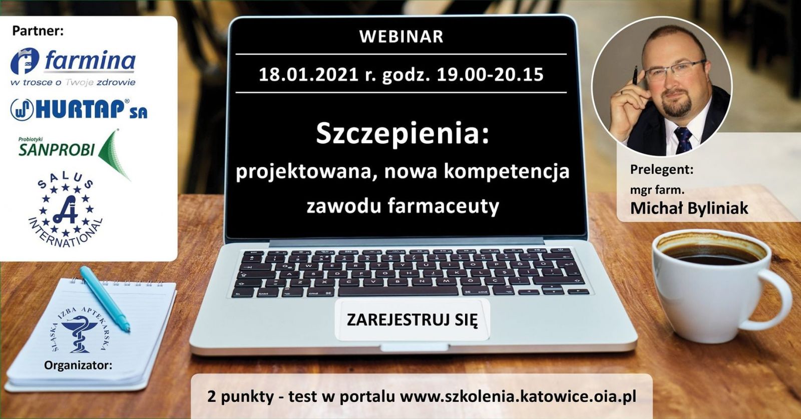 Przypominamy, że już dzisiaj w poniedziałek 18 stycznia o godzinie 19:00 rozpocznie się certyfikowane szkolenie webinarowe z mgr farm. Michałem Byliniakiem pt. "Szczepienia: projektowana, nowa kompetencja zawodu farmaceuty",.