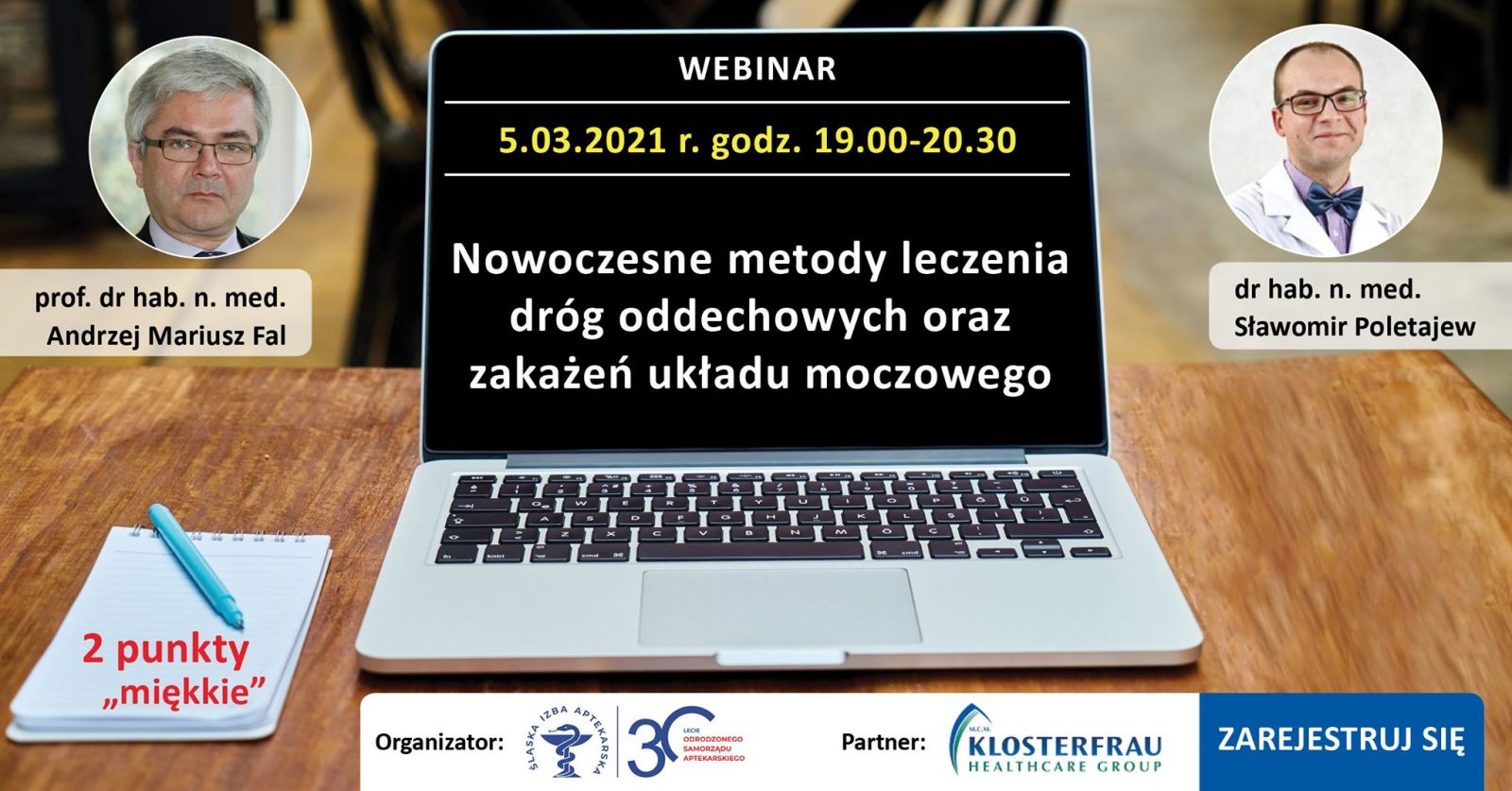 Zapraszamy farmaceutów na certyfikowane szkolenie webinarowe pt. "Nowoczesne metody leczenia dróg oddechowych oraz zakażeń układu moczowego", które odbędzie się 5 marca (piątek) 2021 r. o godz. 19.00.