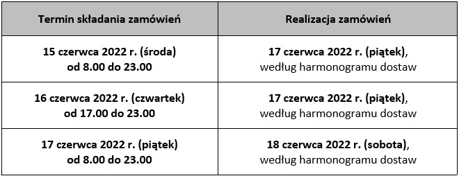 Informujemy, że ze względu na przypadające w dniu 16 czerwca br. Święto Bożego Ciała hurtownia będzie przyjmować i realizować zamówienia według następującego harmonogramu: