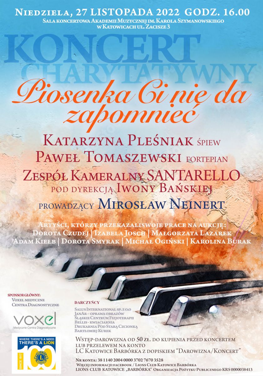 Nasza firma została darczyńcą podczas koncertu charytatywnego „PIOSENKA CI NIE DA ZAPOMNIEĆ", który odbędzie się Sali Koncertowej Akademii Muzycznej im. Karola Szymanowskiego w Katowicach ul. Zacisze 3 w niedzielę 27 listopada 2022 o godz.16:00. Dlatego też zachęcamy Państwa do przyłączenia się do tej szczytnej akcji!!!