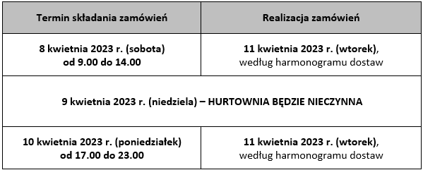 Informujemy, że w okresie Świąt Wielkiej Nocy hurtownia będzie przyjmować i realizować zamówienia według następującego harmonogramu: