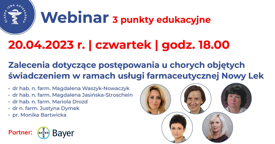 Zapraszamy farmaceutów na webinar pt. Zalecenia dotyczące postępowania u chorych objętych świadczeniem w ramach usługi farmaceutycznej "Nowy Lek", który odbędzie się 20 kwietnia (czwartek) 2023 r. o godz. 18.00.