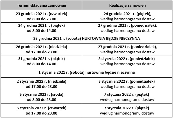 Informujemy, że w okresie świąteczno-noworocznym hurtownia będzie przyjmować