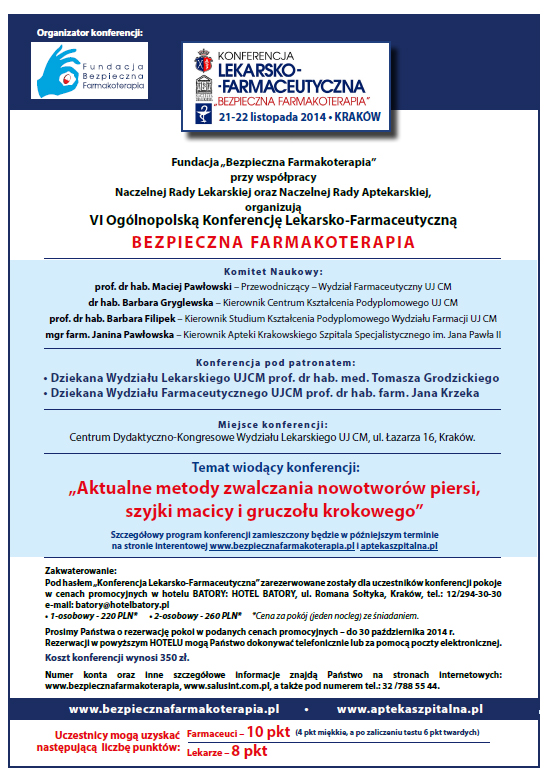 miło nam poinformować, że po raz kolejny Fundacja Bezpieczna Farmakoterapia przy współudziale Naczelnej Rady Lekarskiej oraz Naczelnej Rady Aptekarskiej będzie miała przyjemność zorganizować VI Ogólnopolską Konferencję Lekarsko-Farmaceutyczną "Bezpieczna Farmakoterapia".